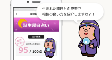 生まれた曜日(誕生曜日)と血液型からあなたの「性格」「仕事」「恋愛・結婚」を占い診断する「誕生曜日占い」。さらにご登録の会員の中から、あなたとの相性度を100点満点で点数化し、特に相性の良いお相手を不定期でご紹介します。