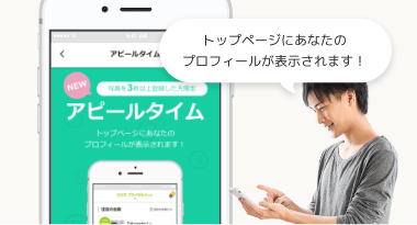 「アピールタイム」をご利用中はプロフィールの閲覧数が増え、「気になる」をもらうチャンスが増えるかも。3枚以上プロフィール写真を登録した方なら、どなたでもご利用いただけます。