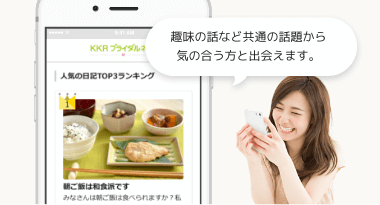 KKRブライダルネットでは自分のプロフィールを目立たせる「アピールタイム」や趣味や価値観からお相手を探す「日記」、「相性診断」など様々な出会いをご用意しております。