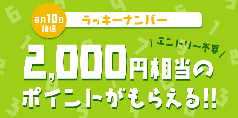 毎月10日にラッキーナンバーを3つ発表します。会員IDの下2桁が合致していたら当選となります。当選者にはサポートセンターより4ポイント(2,000円相当)をプレゼントさせていただきます。