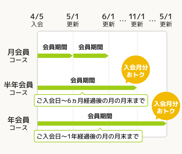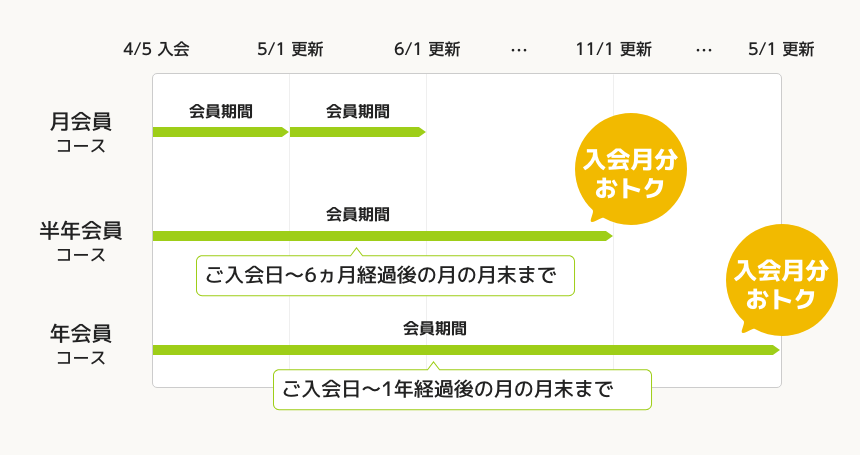 <半年会員コース> 入会日から6ヶ月経過後の月の月末まで。