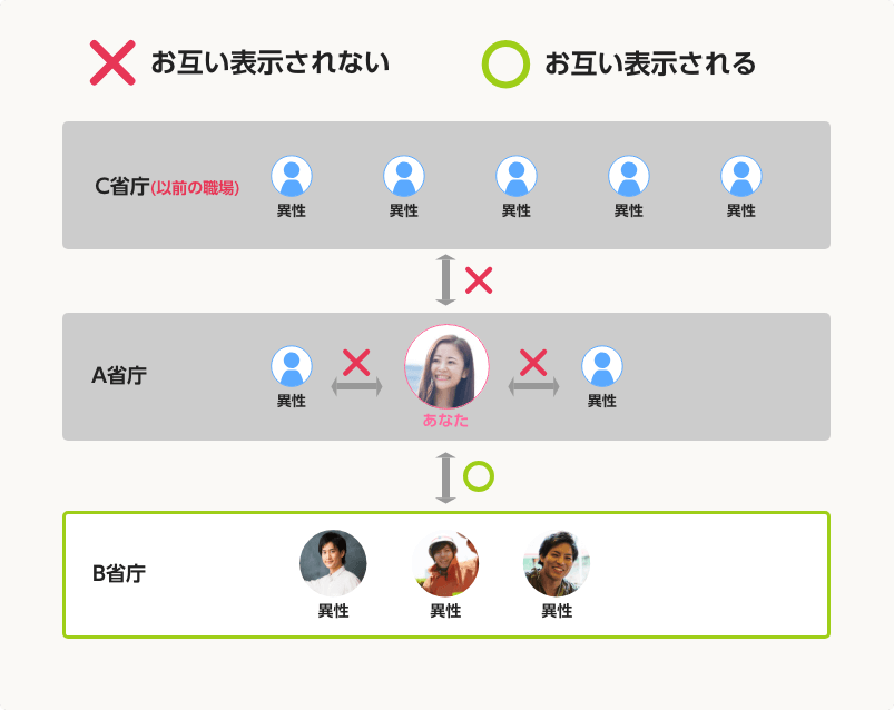 所属している省庁・支部などだけでなく、過去の職場も選択が可能です。職場の異性(支部単位)や、以前の職場の方などにプロフィールを見られることなく秘密を守りながらパートナー探しができます。