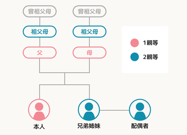 2親等とは本人(独身)から数えて2世を隔てた関係にある人のことです。1親等は父母。2親等は祖父母・兄弟姉妹・兄弟姉妹の配偶者を指します。